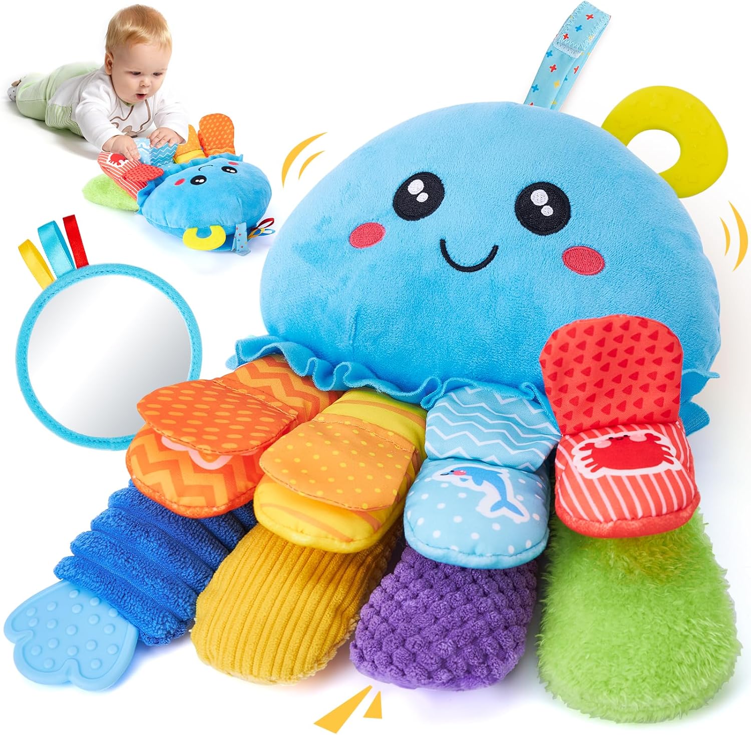 This large, engaging toy is packed with features to keep tiny hands busy! Crinkle paper and a squeaker hide in the tentacles, along with textured flaps for sensory play. Soft, colorful, and full of surprises—it delights babies during tummy time with rattles, crinkly sounds, and a fascination with their reflection.
